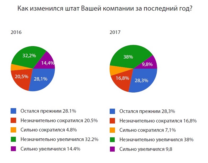 Итоги опроса показали, что изменения в штатах компаний за последний год практически не отличаются от показателей 2016 года: в 48% случаев (47% в 2016) количество сотрудников увеличилось, в 28% (28% в 2016) – осталось на прежнем уровне, в 24 % (25% в 2016) – сократилось.